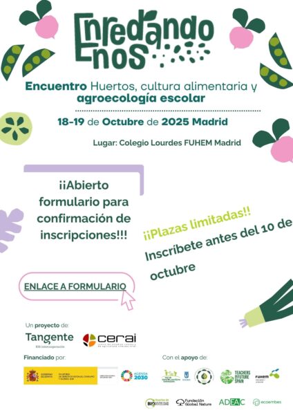 El encuentro se celebra en el marco del proyecto “Enredándonos: una red estatal para fortalecer la agroecología y la cultura alimentaria en las escuelas”, impulsado por Tangente y CERAI, con el apoyo del Ministerio de Derechos Sociales, Consumo y Agenda 2030. Además, contamos con el respaldo de entidades como Teachers for Future, el Ayuntamiento de Madrid, Mensa Cívica, FUHEM y el proyecto Huertos de Boidiversidad, impulsado por la Fundación Global Nature y Ecoescuelas con el apoyo de Ecoembes.