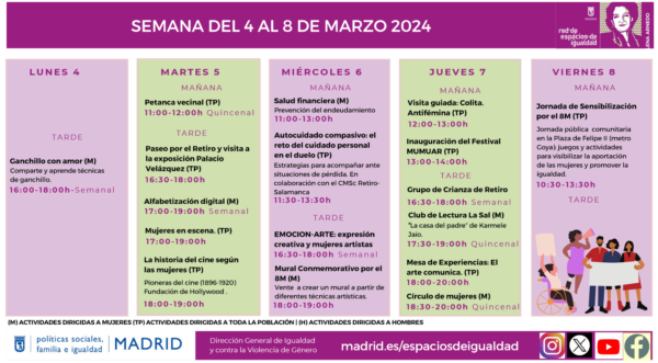 El Espacio de Igualdad Elena Arnedo que gestionamos desde Tangente y que está ubicado en el distrito de Retiro, junto a Puente de Vallecas, ha estrenado un nuevo formato para compartir las actividades que tienen lugar durante este mes de marzo. La nueva estructura facilita la consulta y permite tener una visión calendarizada de las múltiples y variadas actividades que organiza el espacio.